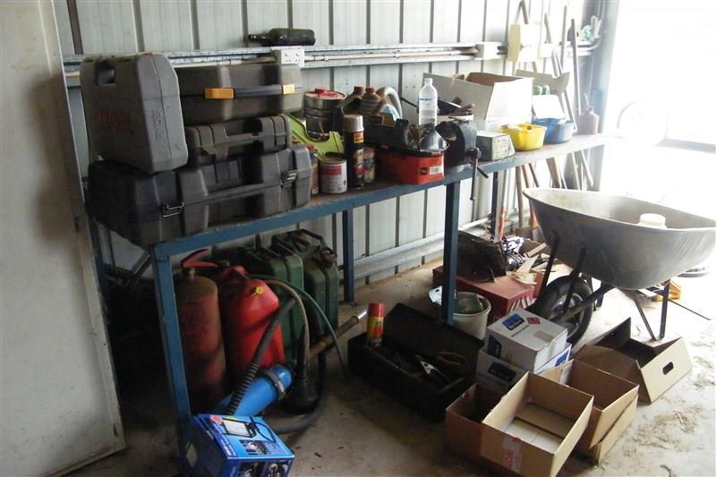 John Deere 145 automatic ride on mower 22hp B & S motor, Masport 2000 lawn mower B & S motor, Husqvarna brush cutter, Goodwill air compressor, Honda E350 generator, boom spray & tank, poly water tank, 2 x enclosed ute crates, 500ltr ground fuel tank, set of heavy duty vehicle ramps, qty of ringlock fencing, aluminium step ladders, shearing gear, heavy duty chains & wire rope, boxes of hand tools, assorted garden tools, wheel barrow, 2 way radio, old welder and sundries to numerous to mention.