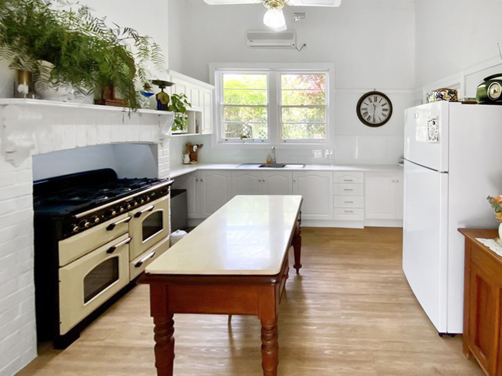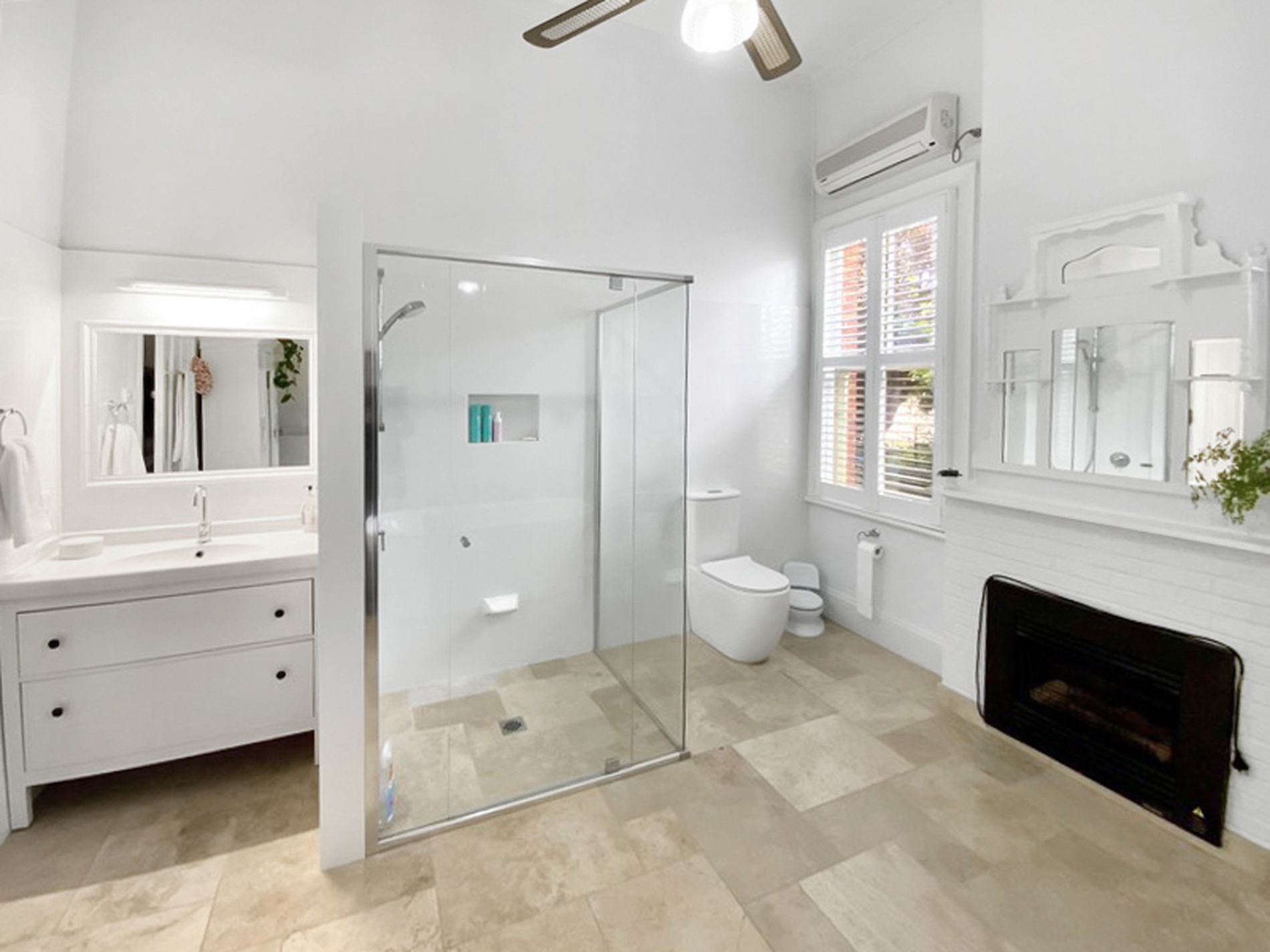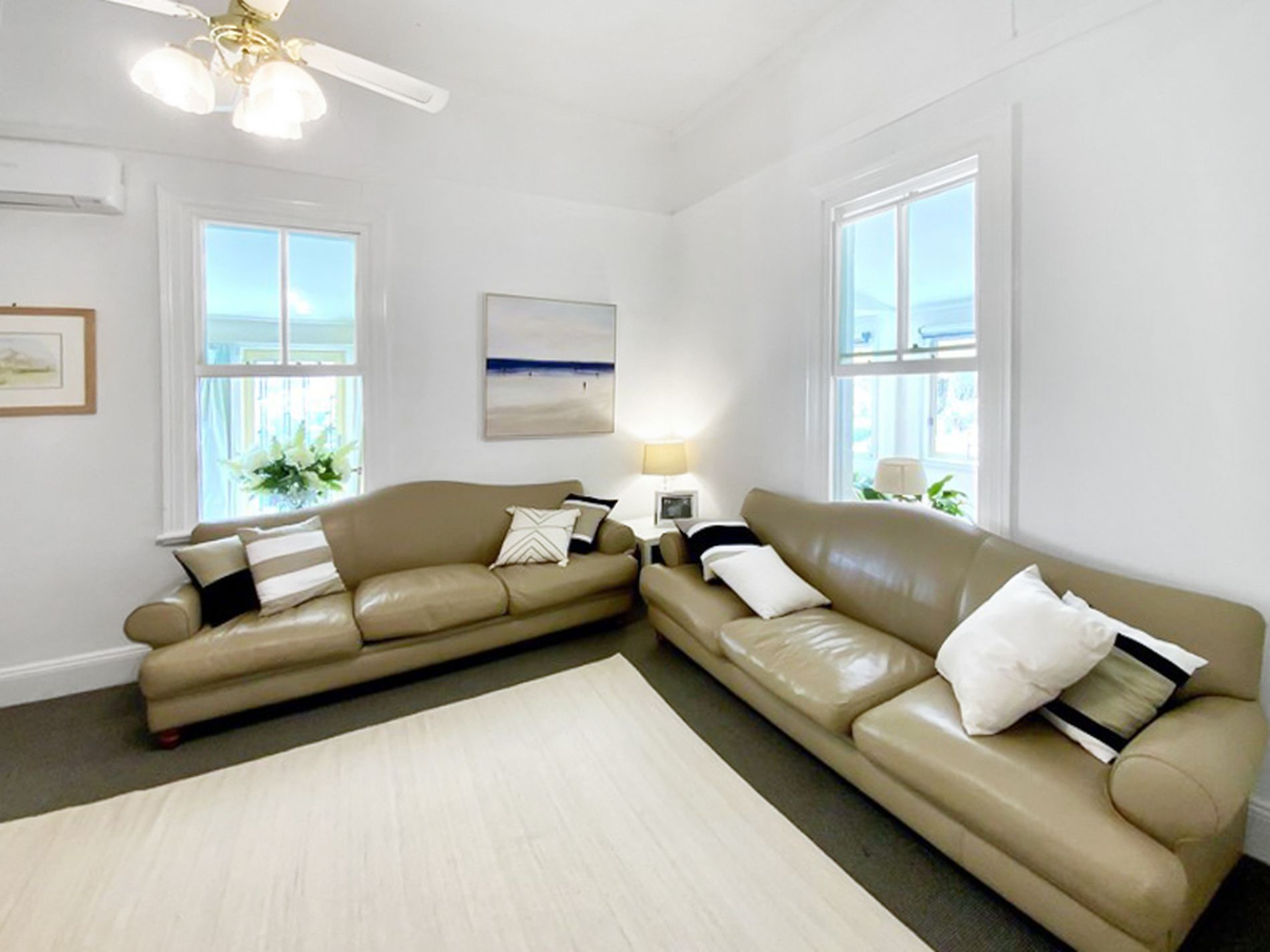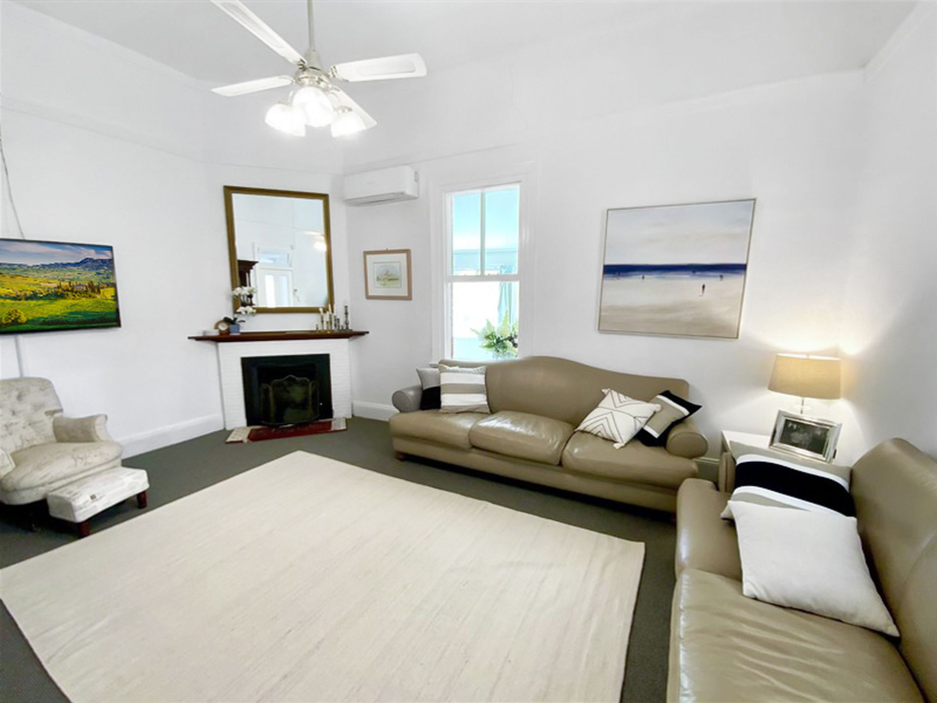 All three bedrooms are spacious, each appointed with split system air conditioning, ceiling fans, and plantation shutters for year-round comfort. The living room is warm and inviting, featuring an original fireplace with gas insert, split system, and ceiling fan.