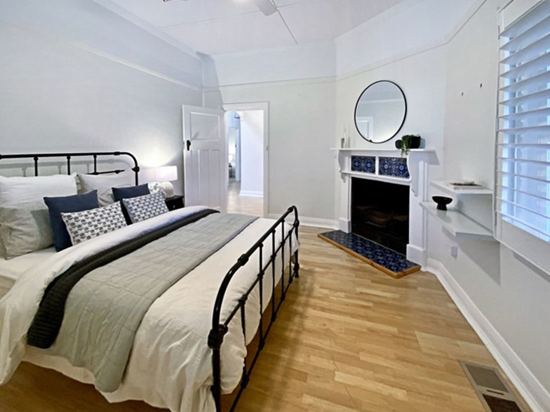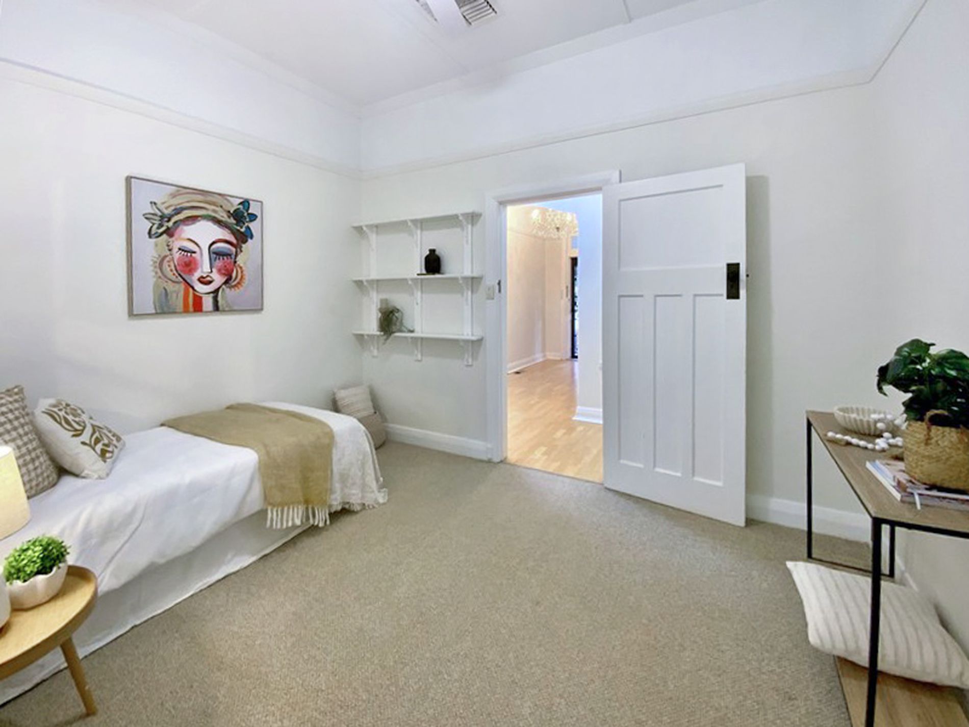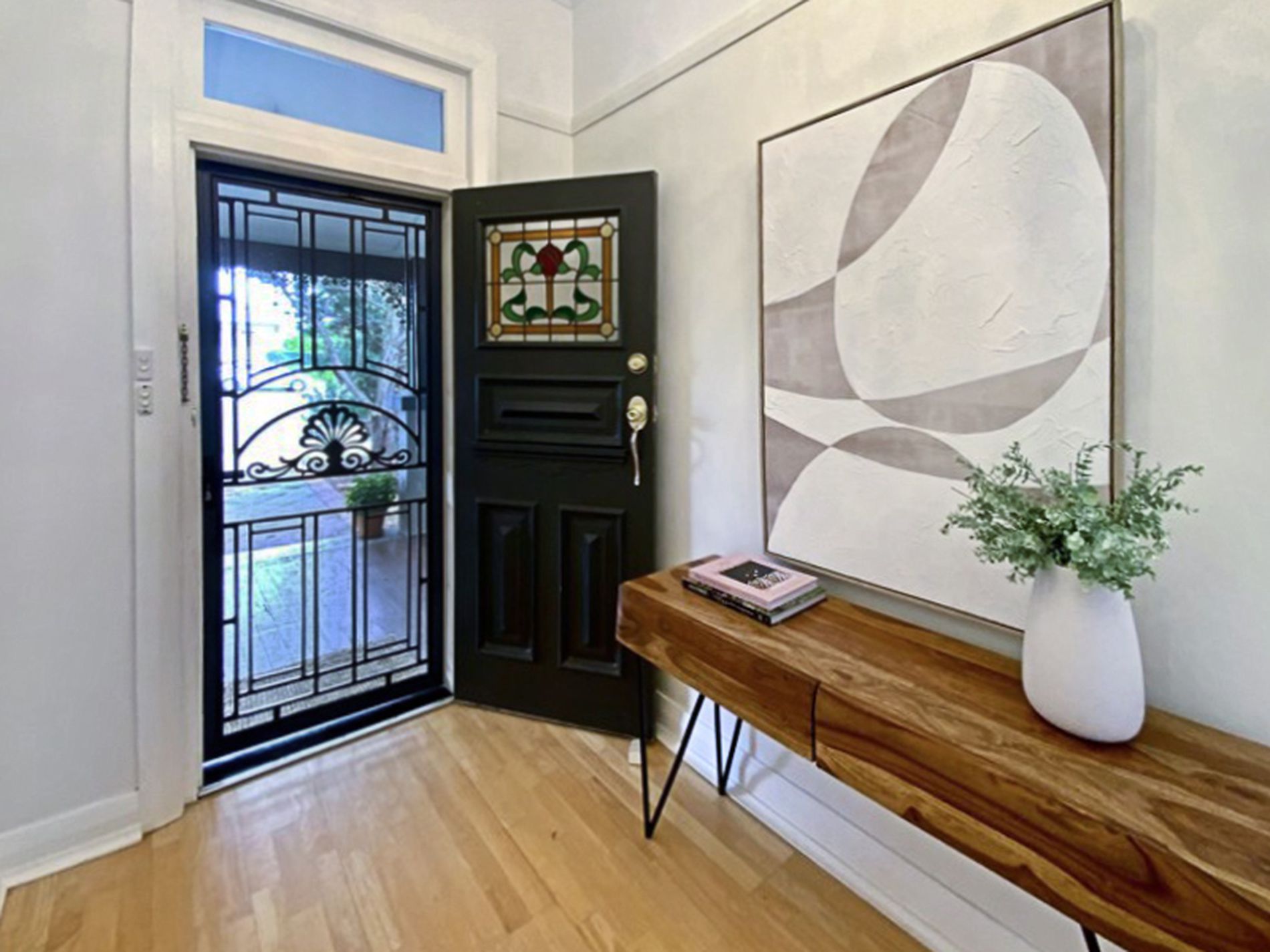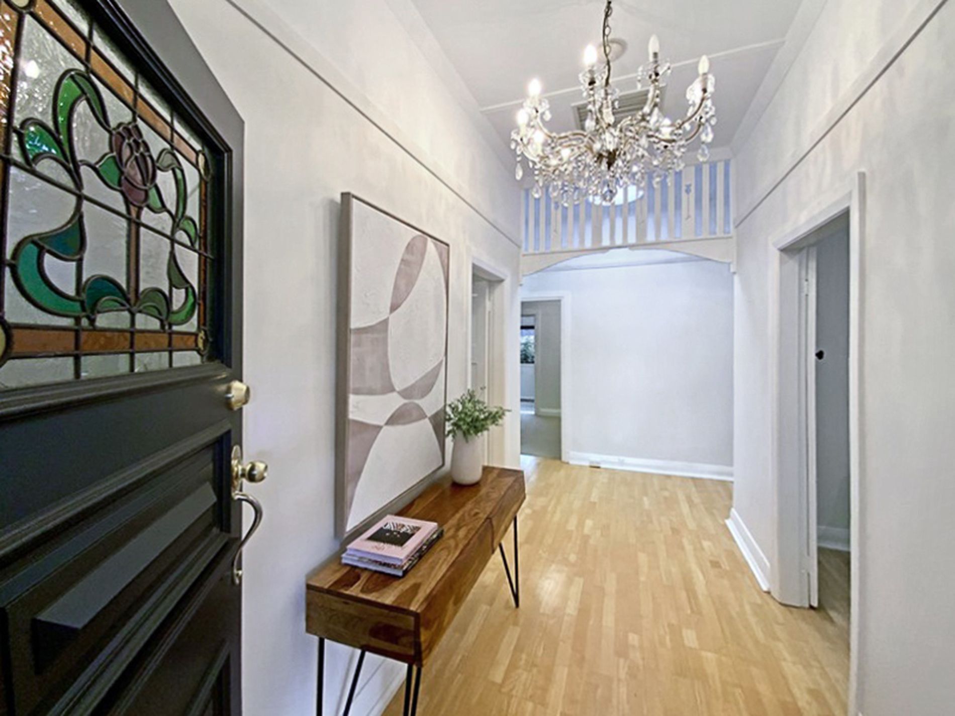 The elegant entry showcases high ceilings featured throughout the home and a stunning chandelier that highlights the intricate original timber fretwork. Classic features such as lovingly restored fireplaces add charm, while thoughtful updates ensure effortless modern living.