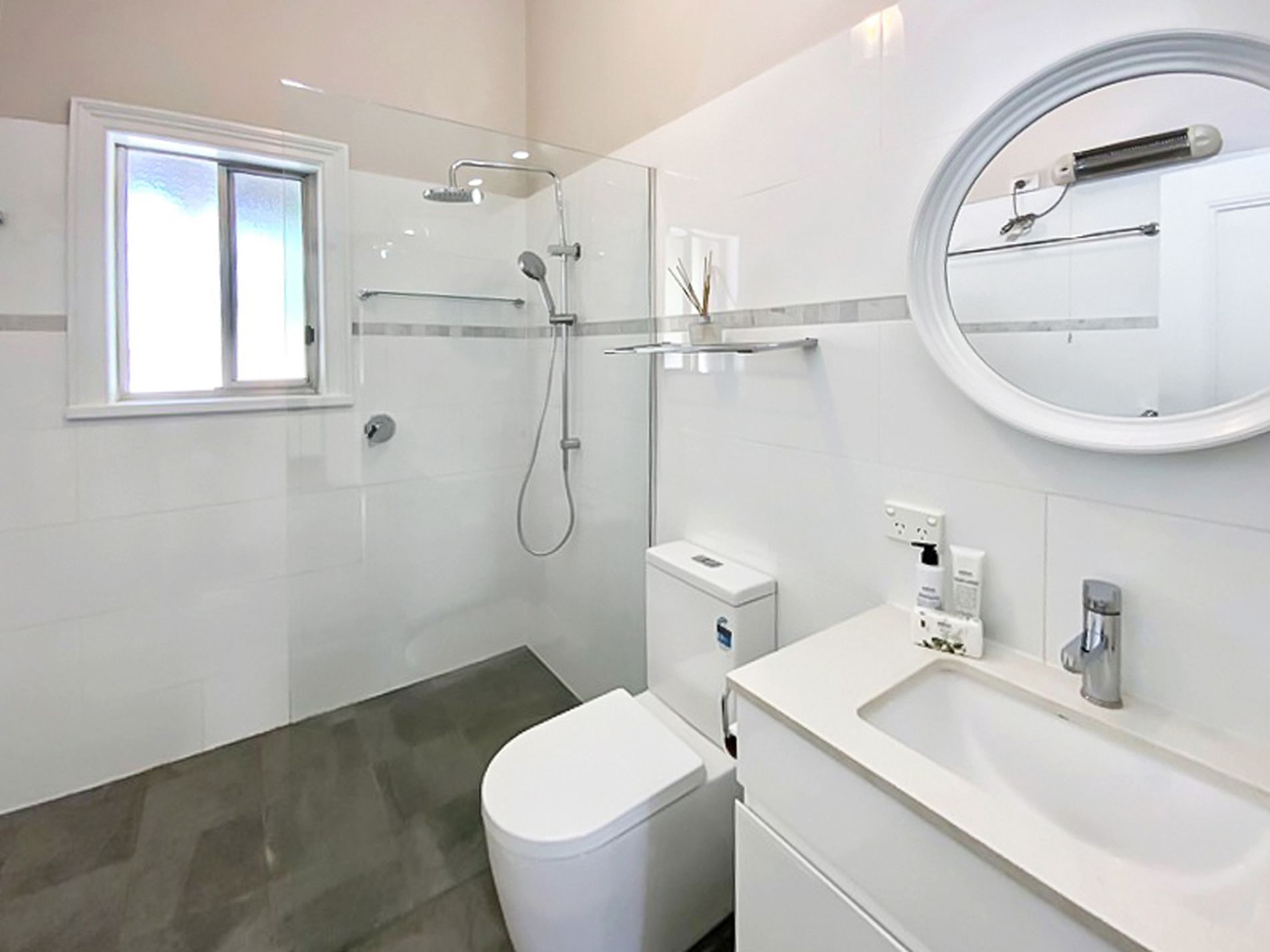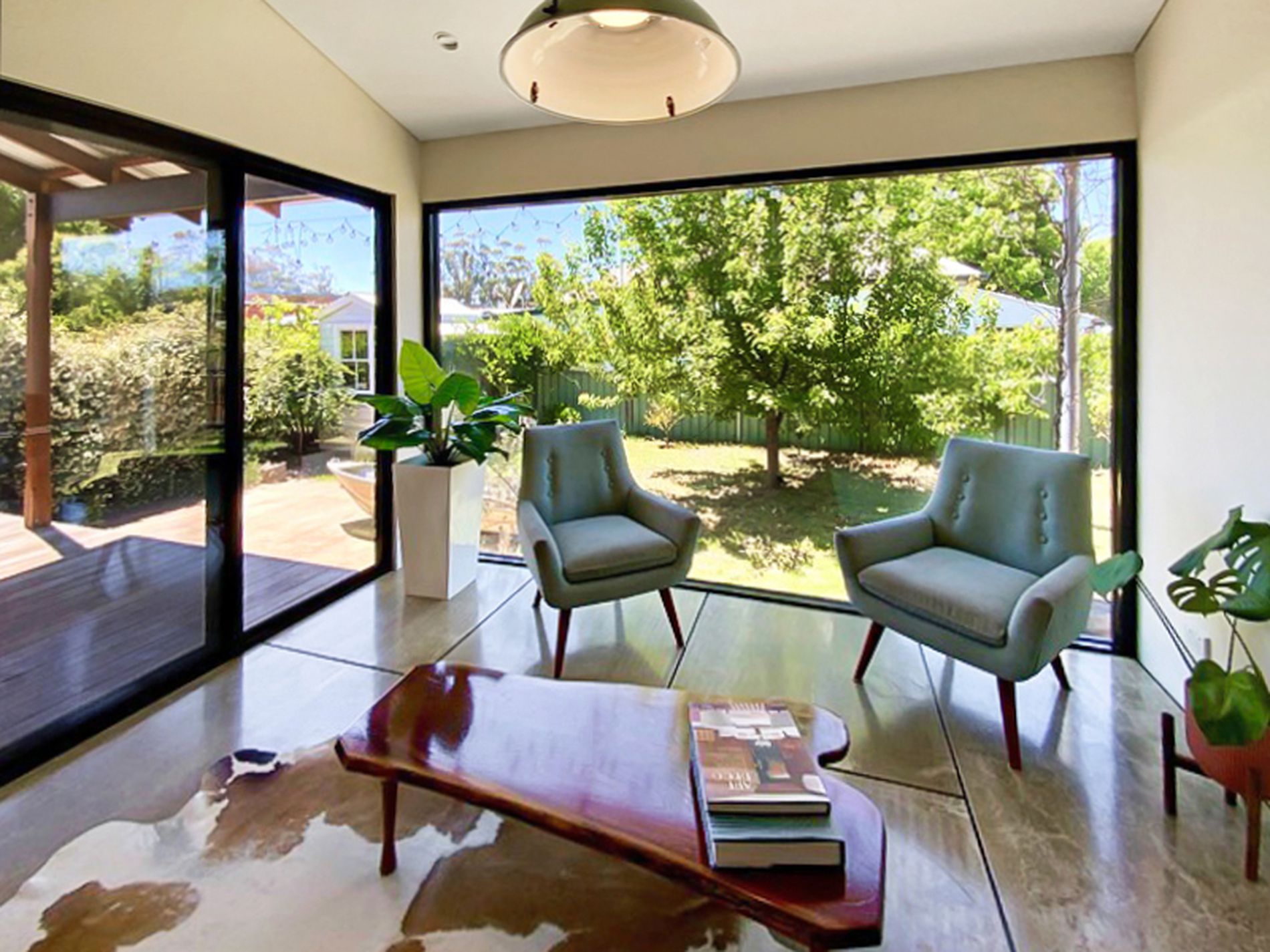 The showpiece of the property is the stylish, contemporary rear renovation. A light-filled open-plan kitchen, dining and living space forms the modern heart of the home, featuring stone benchtops, a 900mm oven with gas cooktop, a large breakfast bar and excellent storage. Expansive glass panels and glazed doors frame the rear extension, creating a seamless indoor–outdoor connection to the elevated deck—an ideal space for entertaining or unwinding while overlooking the backyard.